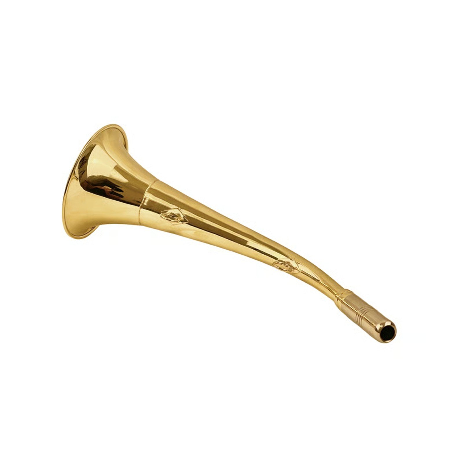 Brass signal/ hunting horn with Nickel mouth piece Key Features ● Brass body with Nickel mouth piece oval opening ● 2 hooks for neck lanyard. ● Polished finished. Length: 40 cm (approx.)